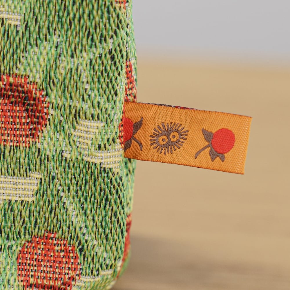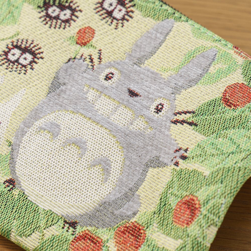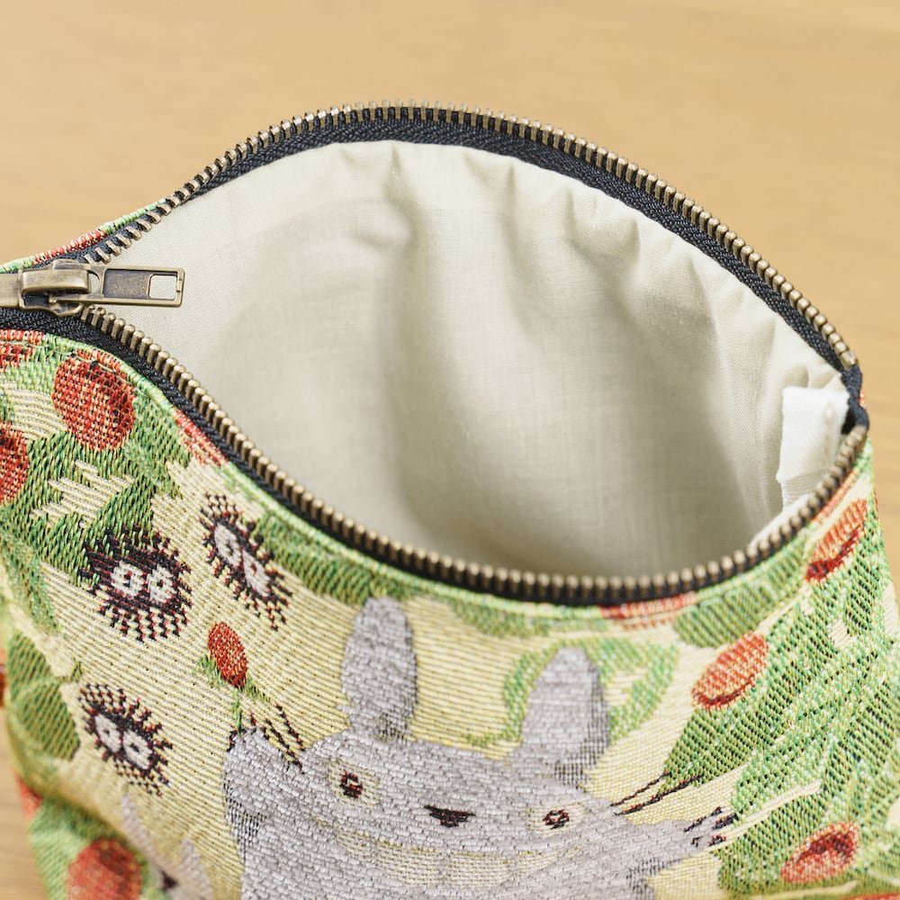 A beautifully crafted Totoro pouch featuring a soft, elegant French-style woven design. Made using Gobelin weaving, the fabric showcases rich textures and detailed artwork with Totoro, soot sprites, and strawberry accents—giving it a refined yet playful look.